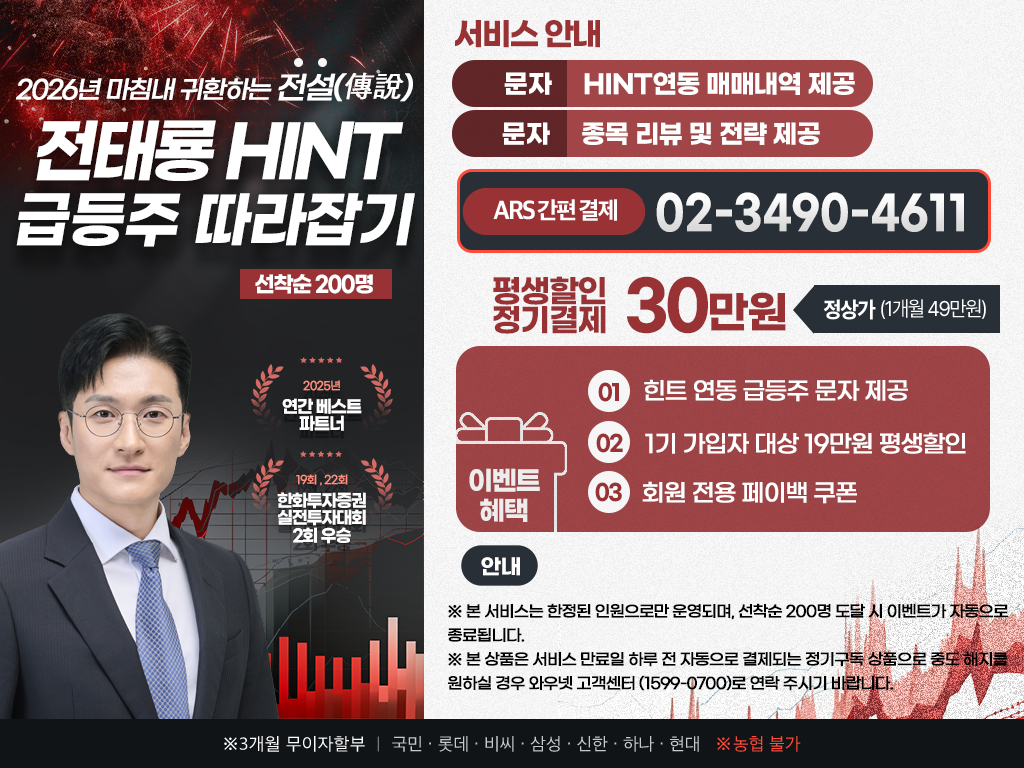 한국경제TV와 파트너는 금융투자업자가 아닌 유사투자자문업자로 개별적인 투자 상담과 자금 운영이 불가합니다.