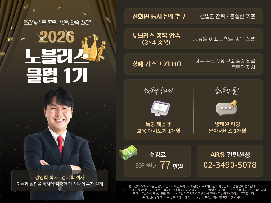한국경제TV와 파트너는 금융투자업자가 아닌 유사투자자문업자로 개별적인 투자 상담과 자금 운영이 불가합니다.