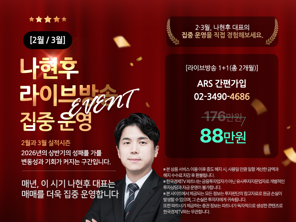 한국경제TV와 파트너는 금융투자업자가 아닌 유사투자자문업자로 개별적인 투자 상담과 자금 운영이 불가합니다.