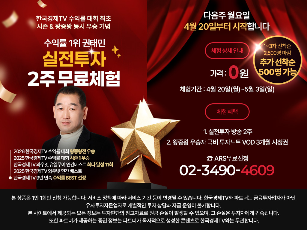 한국경제TV와 파트너는 금융투자업자가 아닌 유사투자자문업자로 개별적인 투자 상담과 자금 운영이 불가합니다.