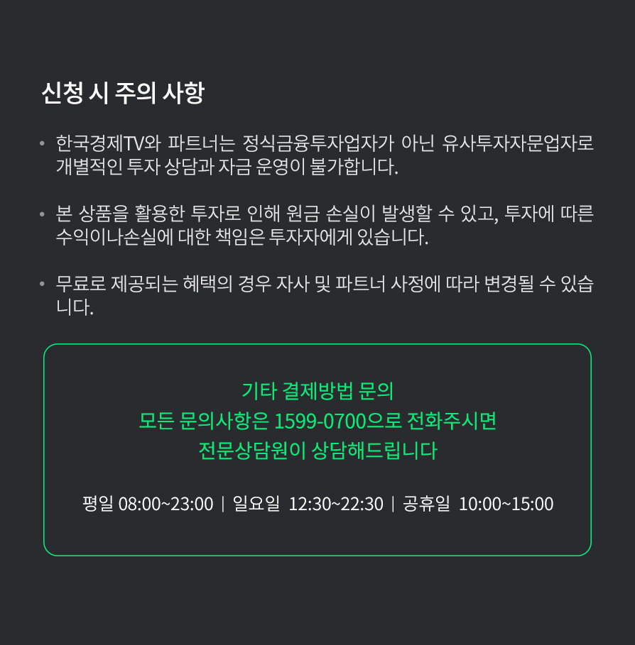 한국경제TV와 파트너는 금융투자업자가 아닌 유사투자자문업자로 개별적인 투자 상담과 자금 운영이 불가합니다.
