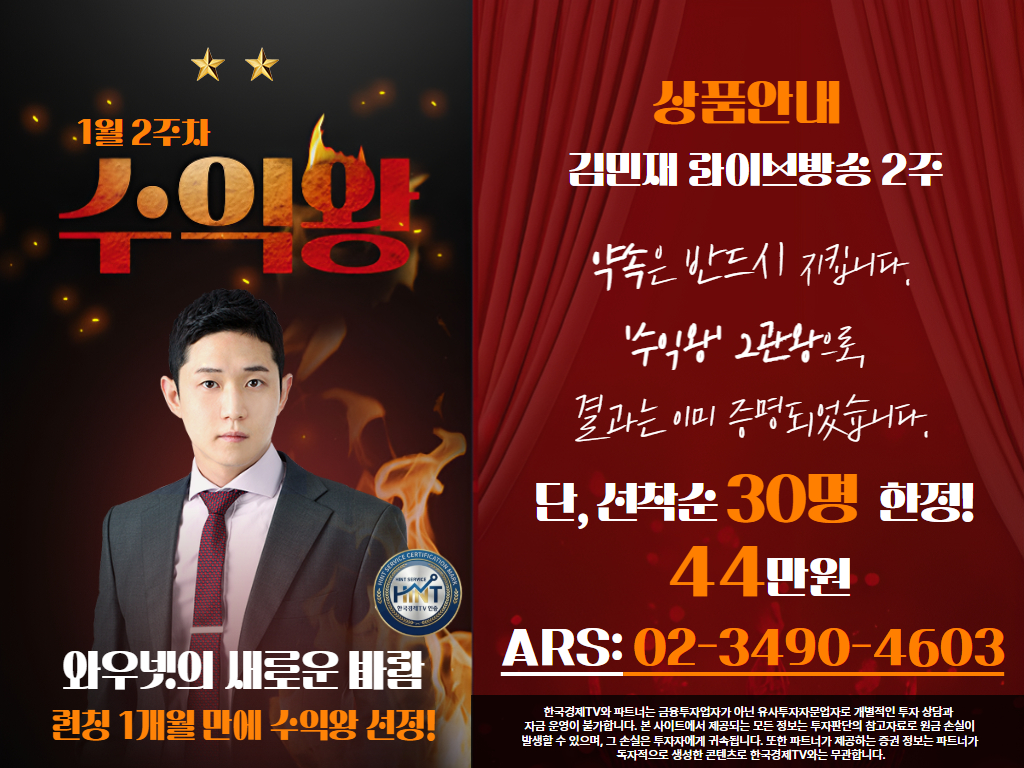 한국경제TV와 파트너는 금융투자업자가 아닌 유사투자자문업자로 개별적인 투자 상담과 자금 운영이 불가합니다.