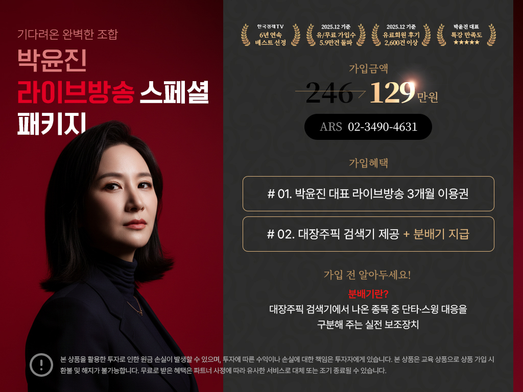 한국경제TV와 파트너는 금융투자업자가 아닌 유사투자자문업자로 개별적인 투자 상담과 자금 운영이 불가합니다.
