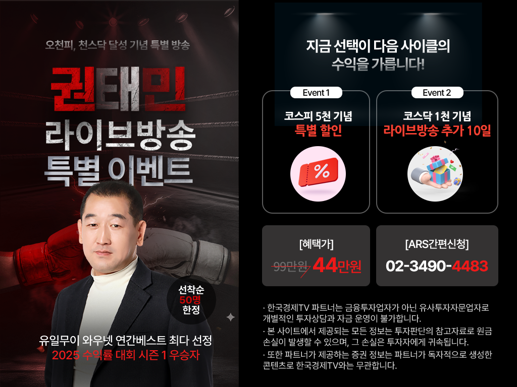 한국경제TV와 파트너는 금융투자업자가 아닌 유사투자자문업자로 개별적인 투자 상담과 자금 운영이 불가합니다.