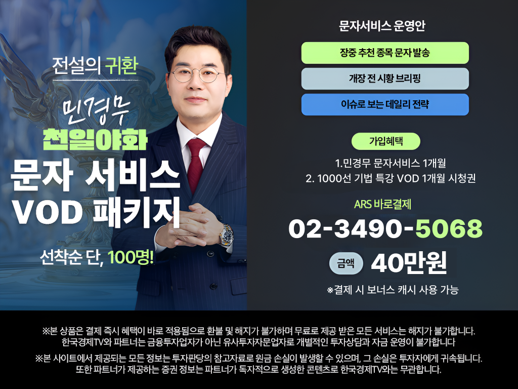 한국경제TV와 파트너는 금융투자업자가 아닌 유사투자자문업자로 개별적인 투자 상담과 자금 운영이 불가합니다.