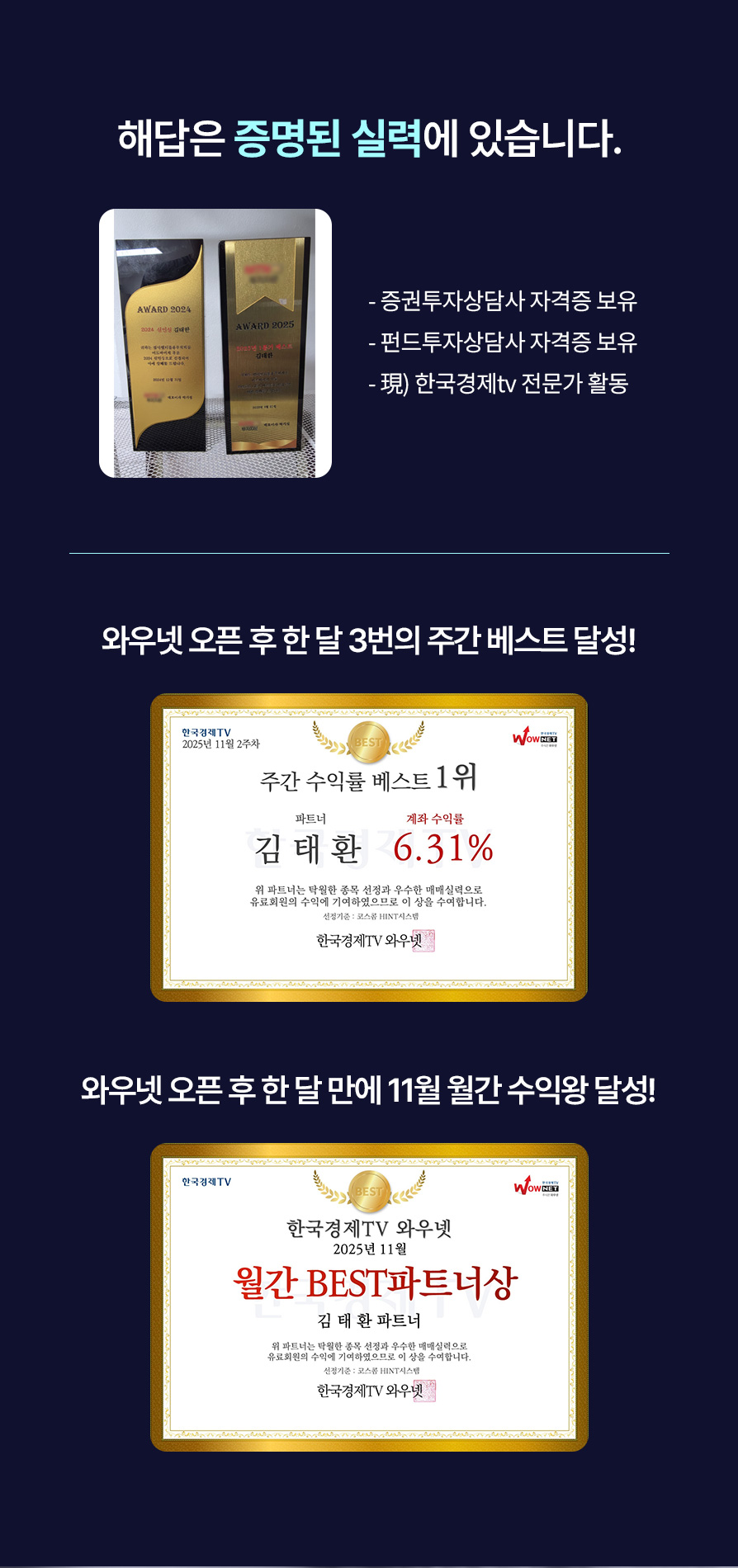 안녕하세요. M사에서 한선호라는 이름으로 출연할 때마다 수익률 상위권과 최단기간 최고 회원 모집 기록을 세우며 흥행을 장악했습니다.
